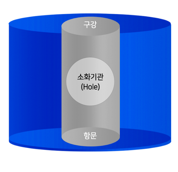 우리 몸을 가장 간단하게 그리면 아래와 같은 도너츠 모양이 되는데, 홀케어 여기서 안쪽 구멍 (Hole Care)에 해당하는 소화 기관을 치료한다는 의미 또한 내포하고 있습니다.
